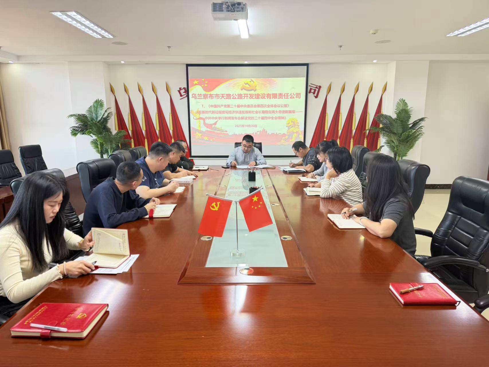 10月30日下午,天路公司党支部组织集中学习了中国共产党第二十届中央委员会第四次全体会议公报、在新时代新征程续写经济快速发展和社会长期稳定两大奇迹新篇章——中共中央举行新闻发布会解读党的二十届四中全会精神等主要内容。此次学习由党支部书记张毅强领学,班子成员及部室职工参加学习。