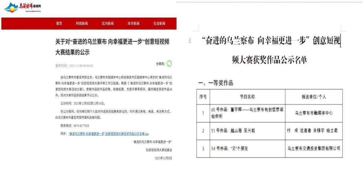 2025年12月8日,由乌兰察布市委宣传部主办的“奋进的乌兰察布向幸福更进一步”创意短视频大赛评选结果正式公布。交投集团选送的作品《“交”个朋友》(编号54)从众多参赛作品中脱颖而出,荣获本次大赛一等奖。