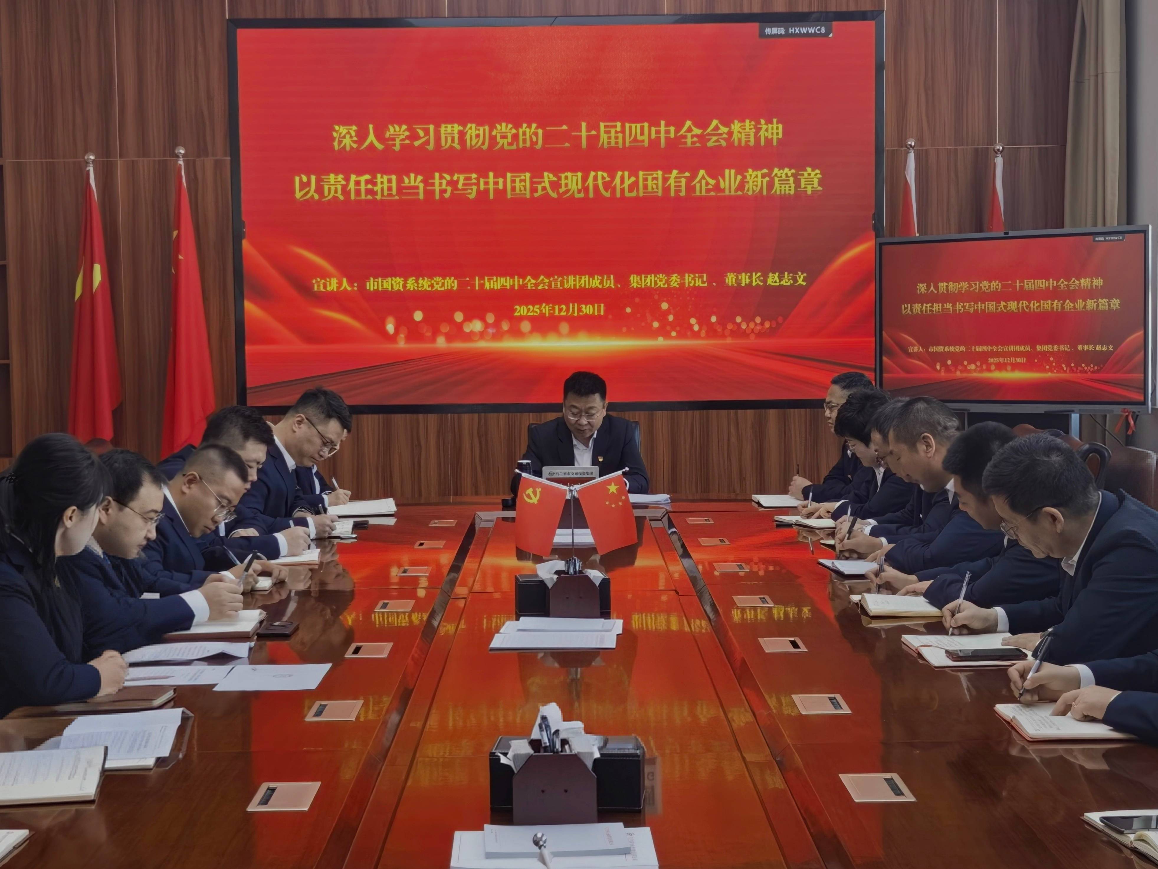 为深入学习贯彻党的二十届四中全会精神,推动全会部署在国有企业落地生根,12月30日,交投集团党委召开党的二十届四中全会精神宣讲报告会。市国资国企宣讲团成员、集团党委书记、董事长赵志文以《深入学习贯彻党的二十届四中全会精神,以责任担当书写中国式现代化国有企业新篇章》为题作专题宣讲,集团党委所属各支部全体党员、预备党员参加会议。
