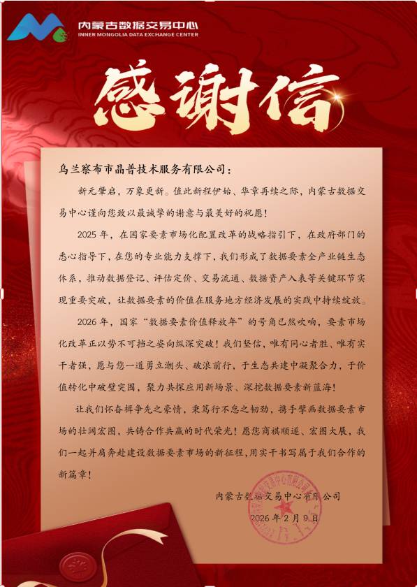 2026年2月9日,内蒙古数据交易中心向我公司发来感谢信,对我公司在2025年度合作中提供的专业支撑给予高度认可。信中肯定,双方在数据登记、评估定价、交易流通及资产入表等关键环节实现重要突破,共同构建了数据要素全产业链生态体系,有效释放了数据价值以服务地方经济发展。