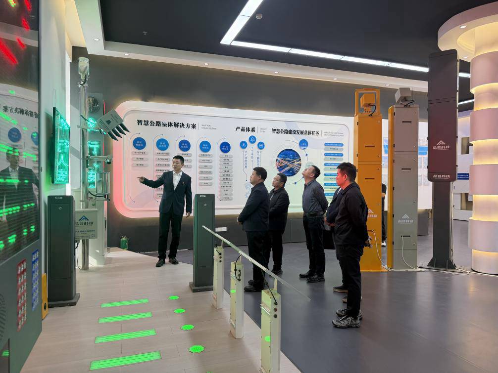 调研组首先实地参观了三楼智慧公路展厅。晶普公司经理刘聪阳向集团领导详细介绍了展厅的整体布局、展示理念及核心功能,重点回顾了公司的发展历程——从初创阶段的技术积累与摸索,到如今在智慧交通领域稳步深耕、持续发力,充分展现了晶普公司在行业内的成长轨迹与发展成效。