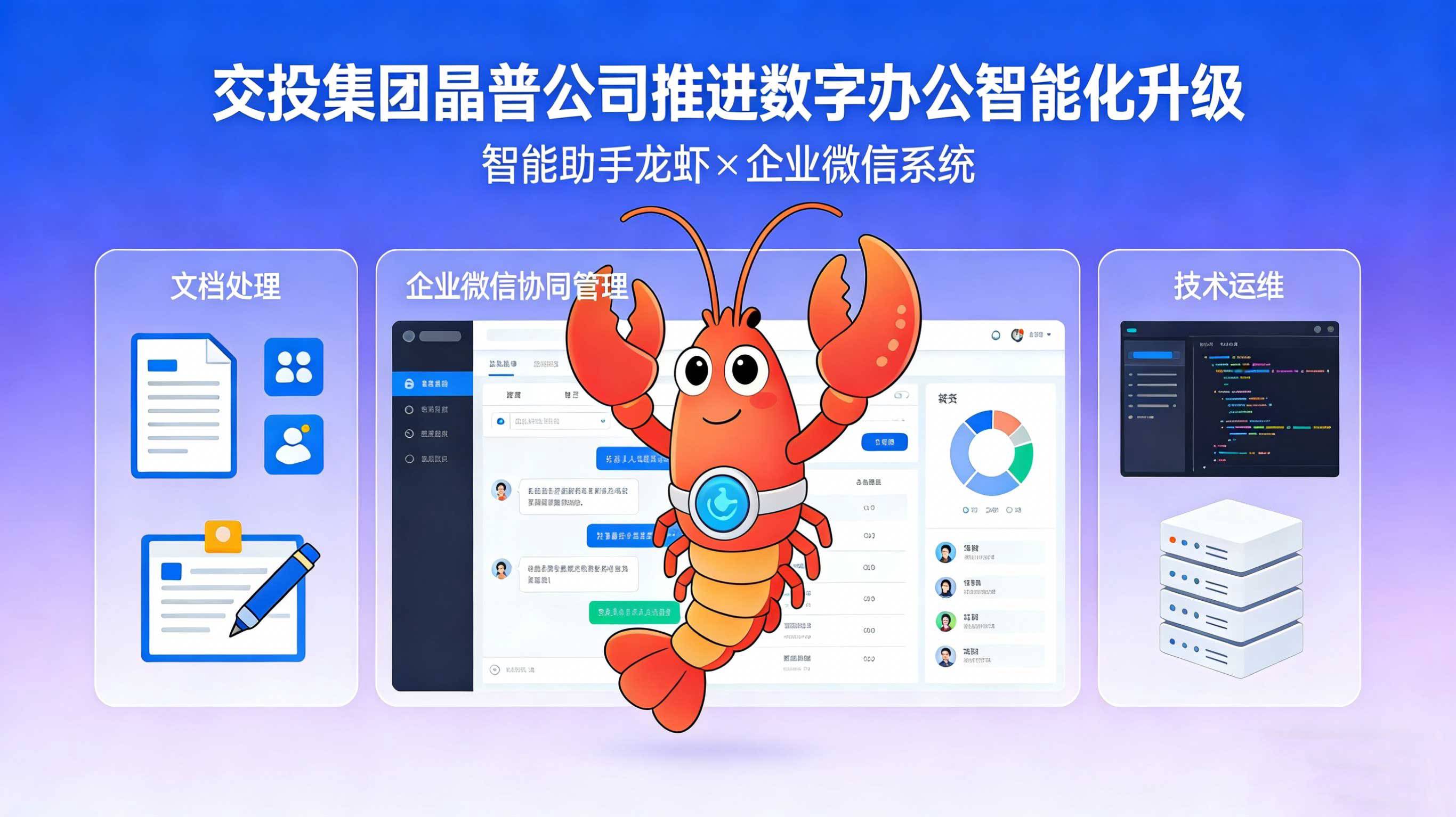 近期,交投集团晶普公司紧扣数字办公智能化升级与业务场景创新需求,深度探索OpenCLAW 技术落地应用,打造智能助手 “龙虾” 并推动其与企业微信系统深度融合,以智能算法重构办公流程、赋能业务场景,实现办公自动化升级与业务场景智能化拓展。