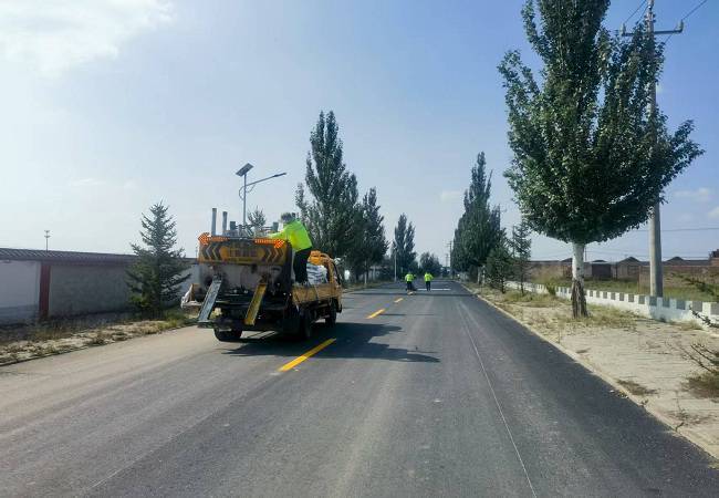 施工现场,施工人员身着醒目的反光工作服,在专业标线设备的辅助下,精准作业。黄色的标线在崭新的黑色路面上逐渐延伸,清晰规范,为道路交通安全提供了有力保障。